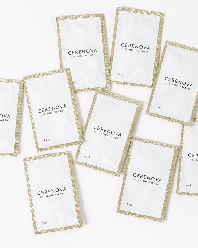 口内を“洗う”から、うるおいで“整える”へ。 歯みがきや一般的なマウスウォッシュでは届きにくい、 口内の乾燥・ねばつき・油性汚れに着目。 CERENOVA オイルマウスウォッシュは、 少量(約1〜2mL)でなめらかに広がるオイル処方により、 水では落としきれない汚れをやさしく包み込みながら、 口内のうるおい環境を整える新発想のケアです。 強く殺菌するのではなく、 うるおいを守り、バランスを整える。 それは、 スキンケアや医薬品の研究から生まれた 「口内のスキンケア」という考え方。 <特長> ◆少量で広がる、圧倒的な保湿力 口内でなめらかに広がるオイル処方により、乾燥・ねばつき・朝の不快感にやさしくアプローチ。 年齢とともに気になりやすい口内の乾燥を防ぎ、長時間しっとりとうるおいを保ちます。 従来のオイルプリングのように大量のオイルは不要。 毎日無理なく続けられる、新しいオーラルケア習慣です。 ◆天然由来成分のみを使用 国産米ぬかオイルをはじめ、天然由来成分のみを使用。 ローズゼラニウム等の天然精油がふんわり香ります。 ◆使用後は排水口に流せる特許処方 唾液と混ざることで乳化する独自処方により、使用後はそのまま排水口へ流せます(特許出願済)。 衛生的で扱いやすく、すでに複数のデンタルクリニックやサロンで導入が進んでいます。 <全成分> コメヌカ油、セスキオレイン酸ソルビタン、ヒマワリ種子油、ツボクサエキス、トウモロコシ胚芽油、ニオイテンジクアオイ油、トリオレイン酸ポリグリセリルー5、チョウジつぼみ油、トコフェロール ※ パッケージ裏面では「香料」と表示していますが、使用している成分は、ニオイテンジクアオイ油(ローズゼラニウム精油)です。 <使用方法> 本品を口に含み、1分以上すすいでから吐き出してください。 ※ パッケージには「3分以上」と記載されていますが、初めての方や忙しい時は、1分程度からでもご使用いただけます。 <容量> 2mL(1回分)個包装。 初めての方のお試し用や、外出先・旅行にも便利です。 <製造国> 日本 <使用シーン> ・毎朝の口内リフレッシュ ・就寝前のケア ・乾燥の季節のうるおい補給 ・マスク時の口内ケアにも ・移動中や長時間のフライトなど、水が使いにくいシーンにも <お手入れ・取り扱い注意事項> 直射日光を避け、常温で保管してください。 開封後はお早めにご使用いただくことをおすすめします。 お子様の手の届かない場所で保管してください。 <発送に関するご案内> ご注文後、3営業日以内に発送いたします。 在庫状況により発送が遅れる場合がございますのでご了承ください。 <送料> 3,000円以上のご購入で送料無料となります(ゆうパケットポスト対応)。 <その他の情報や注意事項> 異常を感じた場合は使用を中止し、医師へご相談ください。